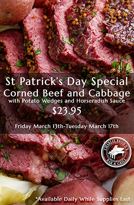 We’ll be serving Corned Beef and Cabbage from Saturday, March 14 through St. Patrick’s Day, Tuesday, March 17.