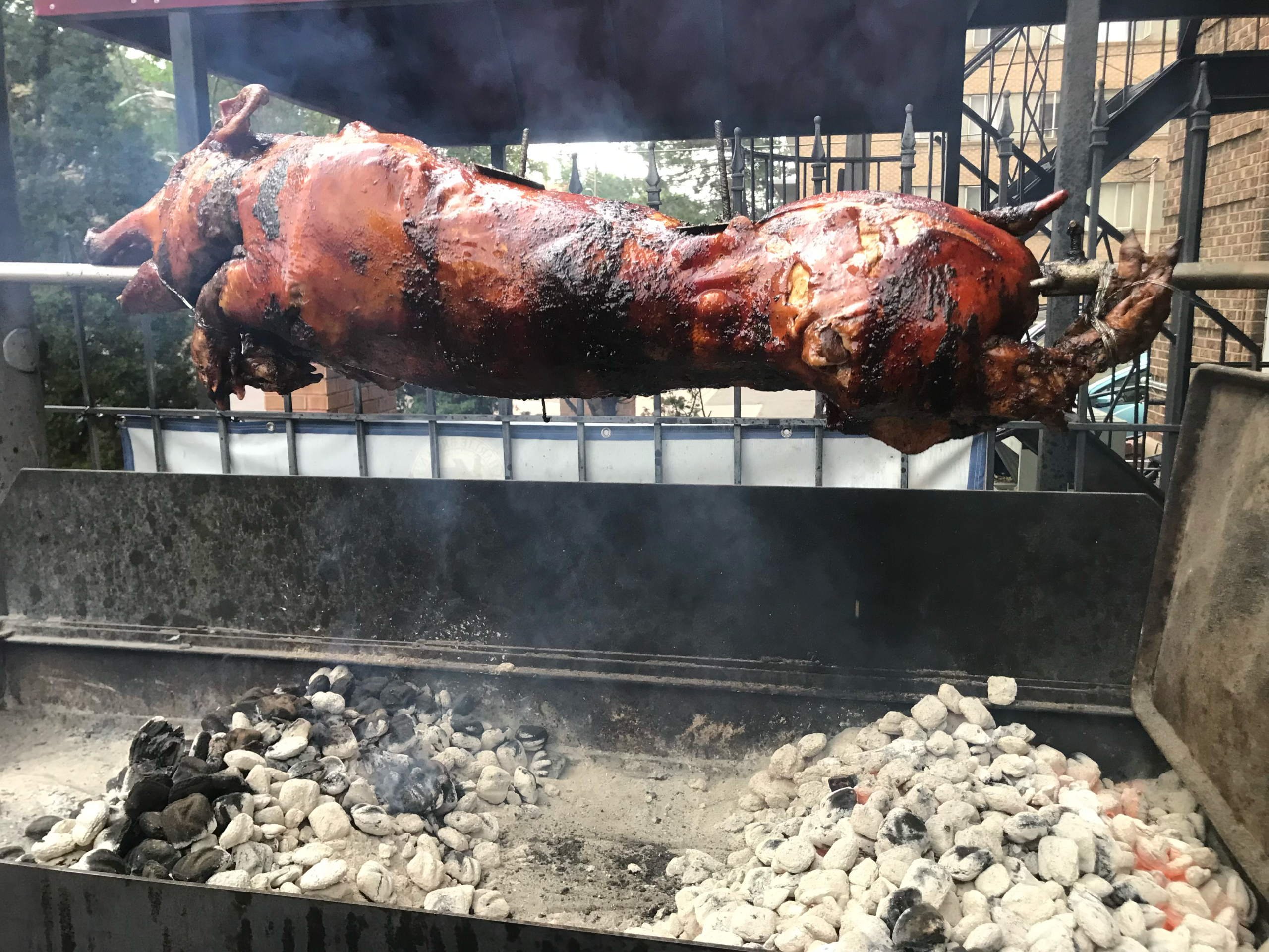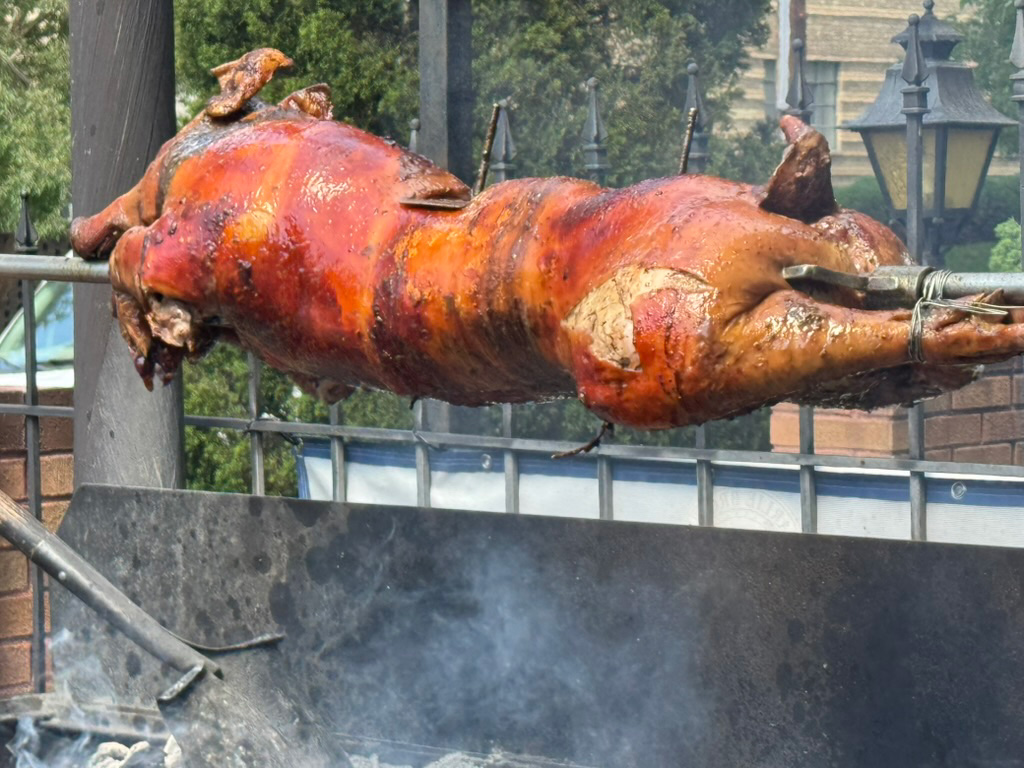 Come early, grab a drink, and watch the roast — once the pig comes off the roaster, plates go fast.